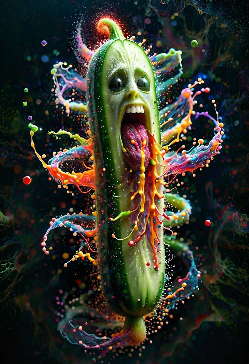 a cucumber with veiny human skin, with putrid stench wafting in the air and ais-particlez emanating in a dazzling array of colors, enveloping the entire scene. <lora:Particles_Style_SDXL:1>