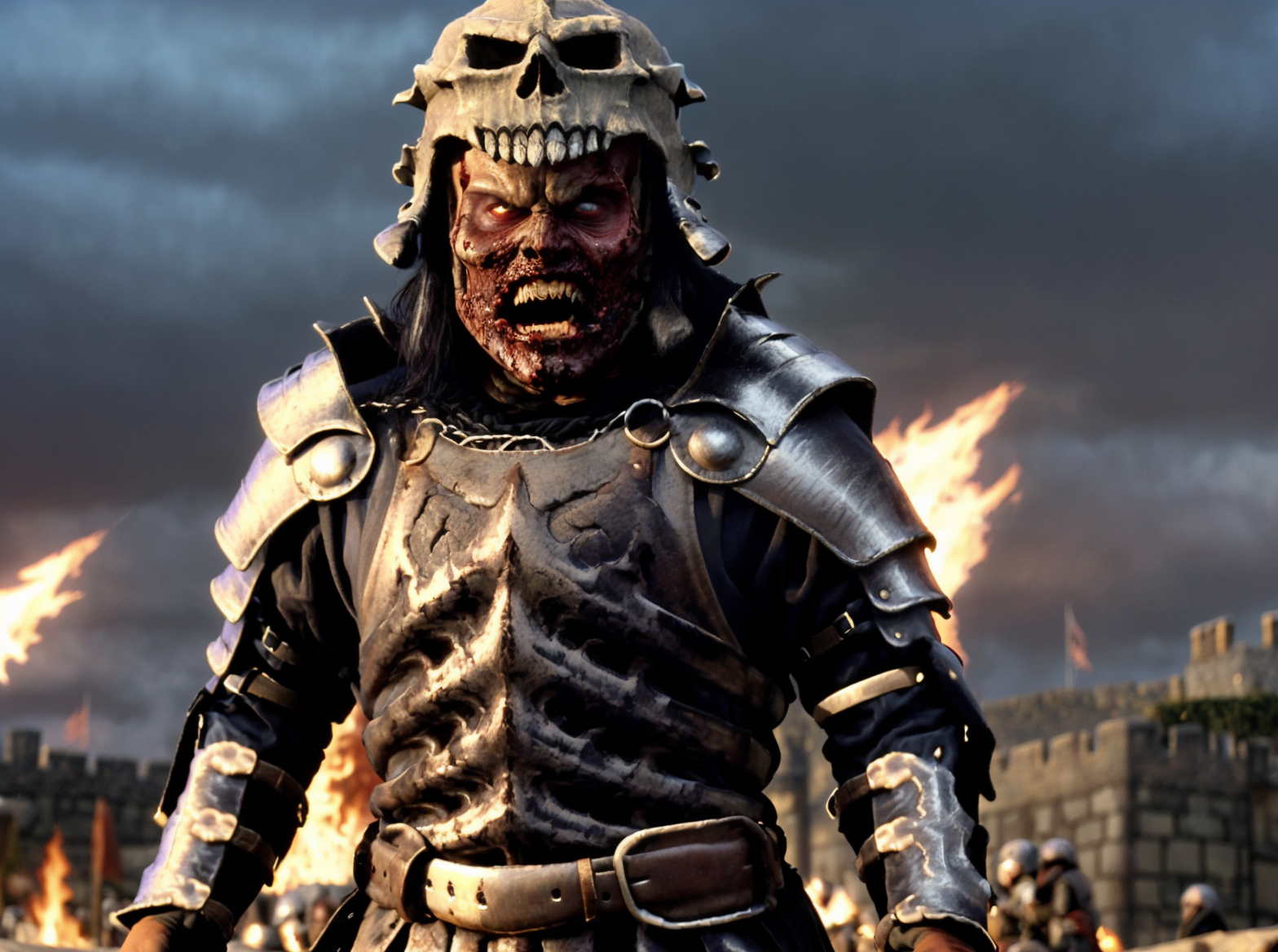 high res, badash, deadite, full body, horrific face, angry, red skin, dirty shirt, skull helmet, medieval armour, realism, dark castle background <lora:Ash_Williams_Evil_Dead__Army_of_Darkness:0.8>