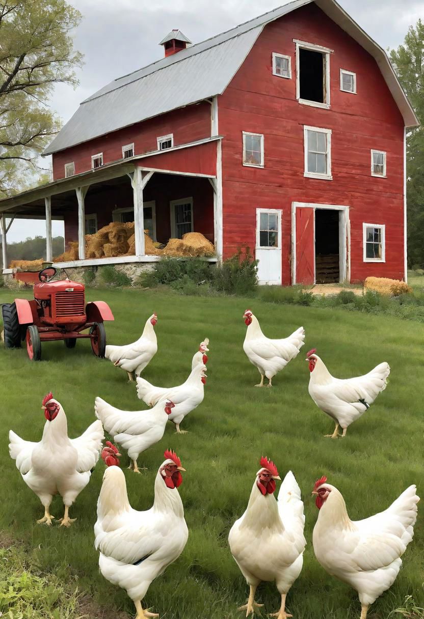 chickens in a field, vintage red farmhouse, big rustic antique farmhouse