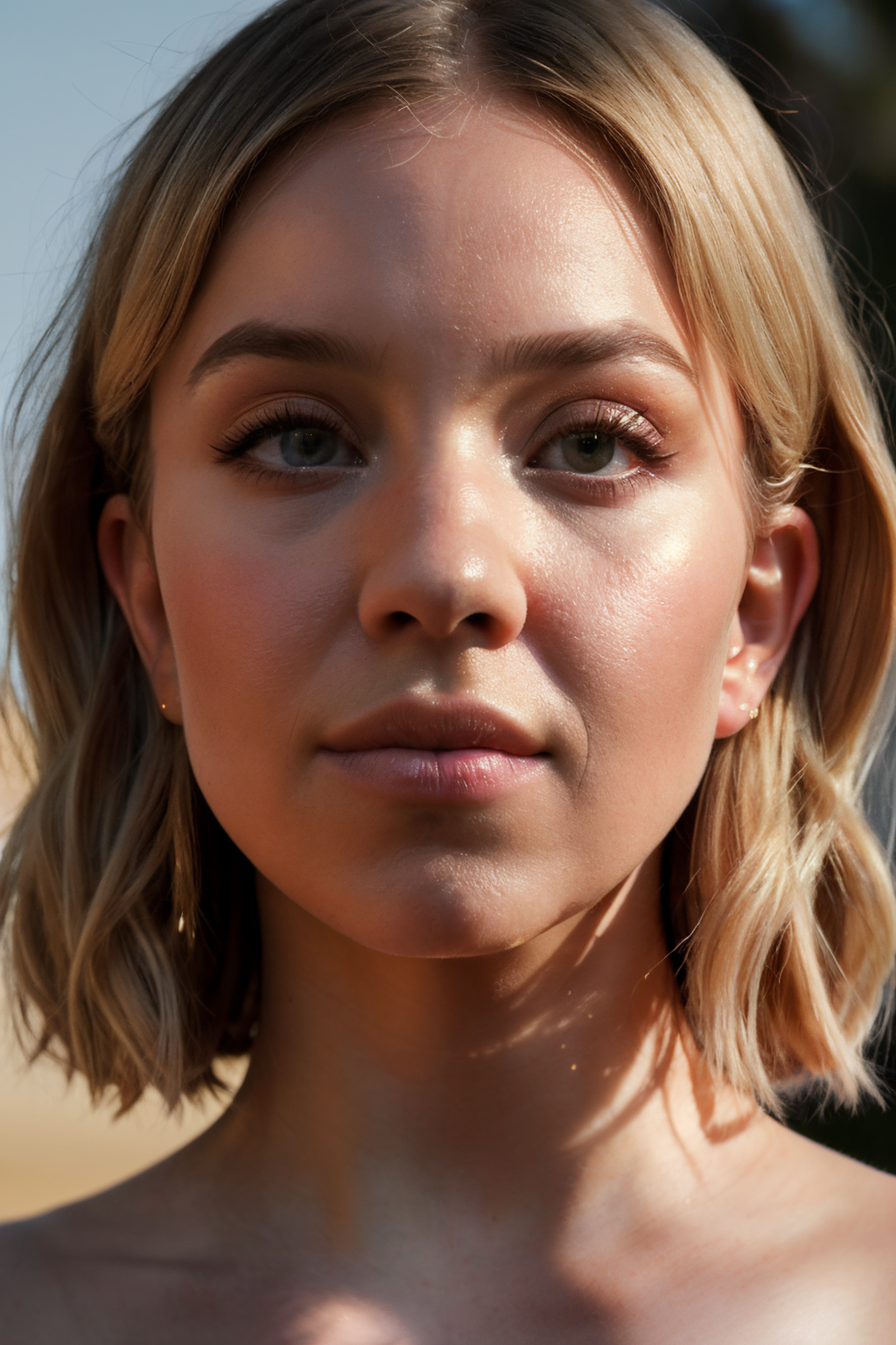 face shot of sydneyS1, (serious look), (blonde medium length hair), (hand on chin), Photorealistic, Hyperrealistic, Hyperdetailed, analog style, hip cocked, demure, detailed skin, matte skin, soft lighting, subsurface scattering, realistic, heavy shadow, masterpiece, best quality, ultra realistic, 8k, golden ratio, Intricate, High Detail, film photography, soft focus, detailed skin texture, (blush:0.5), (goosebumps:0.5), subsurface scattering