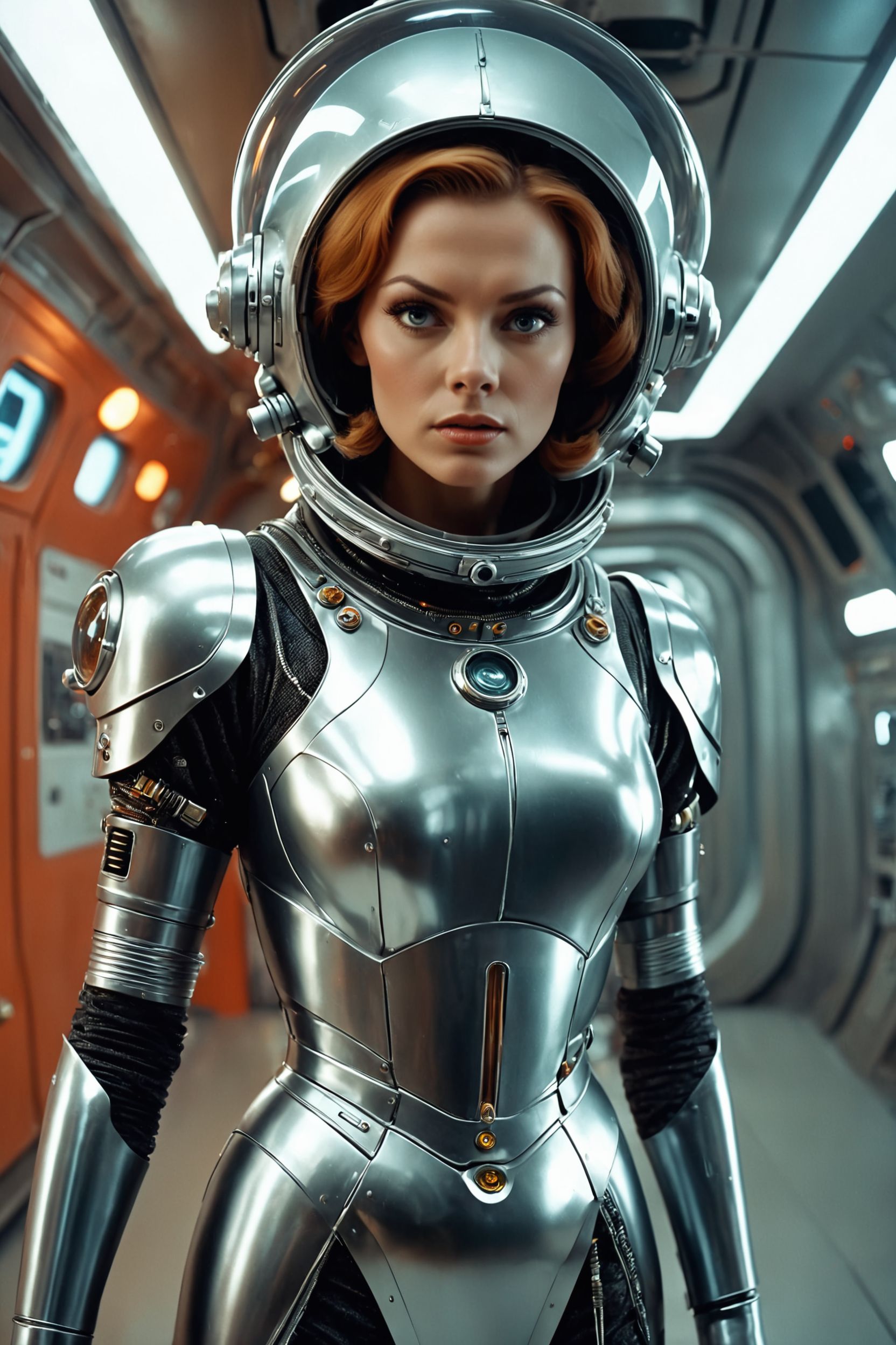campy analog film still from a 1960s soviet sci-fi movie, swedish female positronic cyborg with a space helmet, electrical robe, (sfw:1.2), eclectic space station interior, blinkenlights, intense stare, bold stance, space glam chic, kitsch,cinematic,wacky,glitter,retro, sharp focus, wide angle lens, scenic
