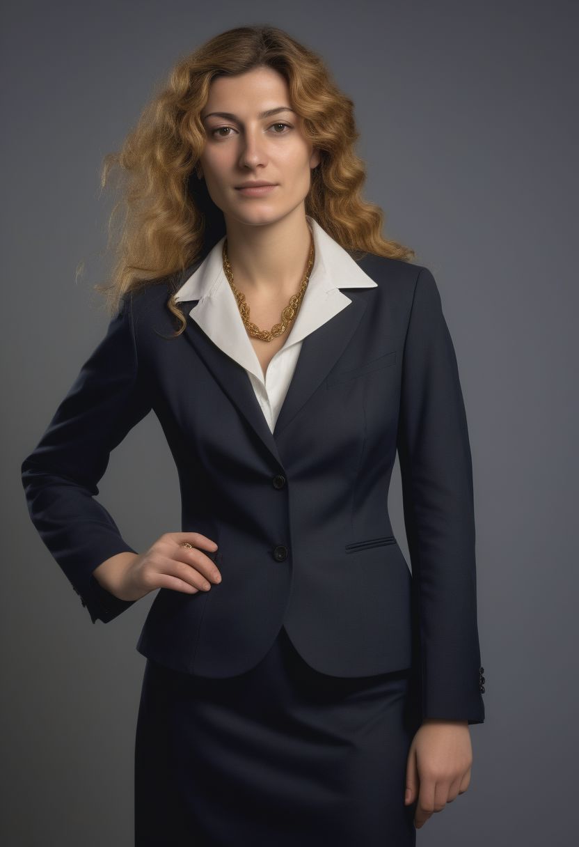 Photograph of Simonetta Cattaneo Vespucci, Botticelli's model for Birth of Venus, woman, 24yo, wearing office attire, managerial style, standing for a formal portrait, CEO, executive,