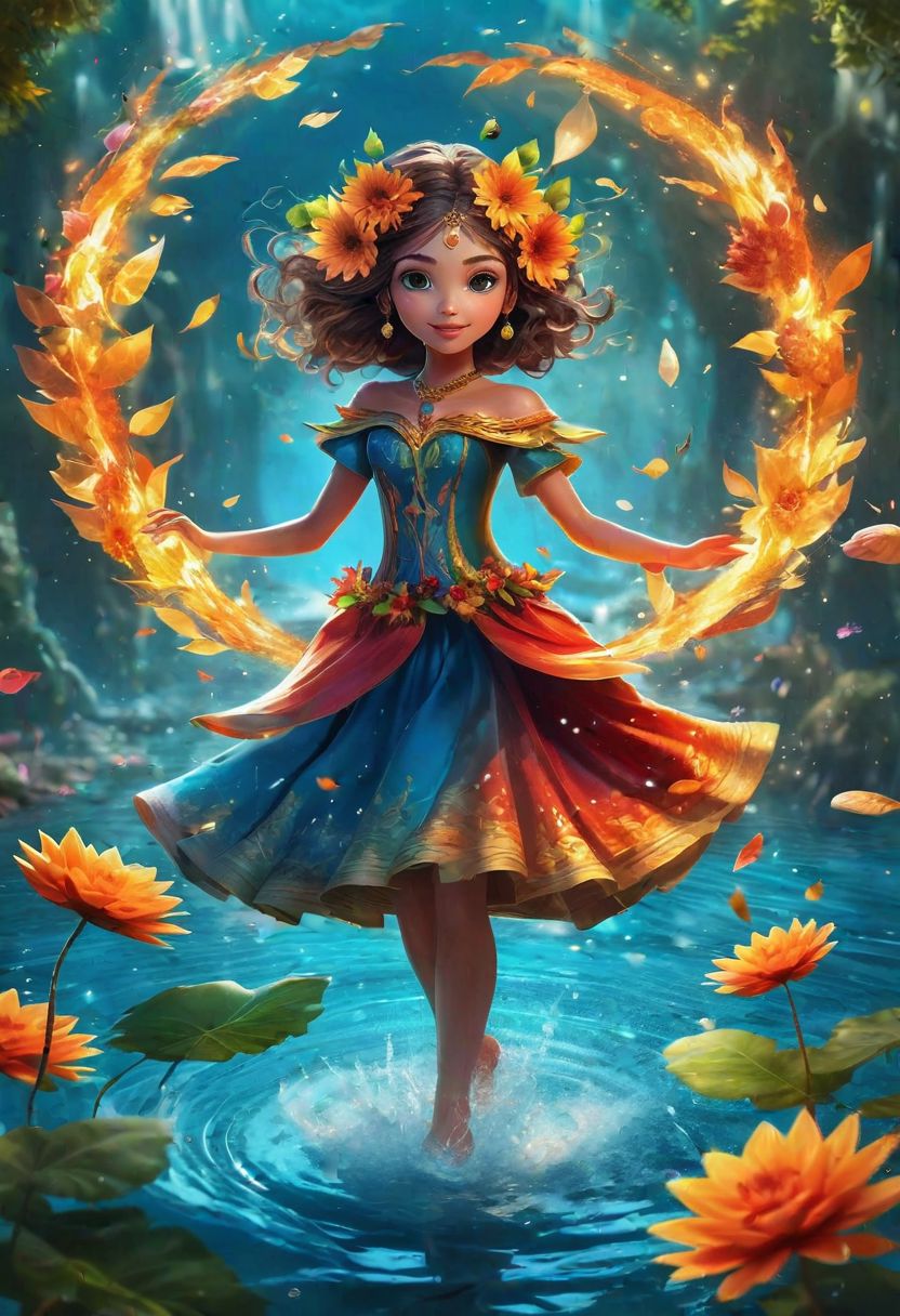 Surreal, future, a cute little girl with big eyes, slim face, happy expression, glowing body, wearing a costume made of flowers and leaves, with a background of water and fire, magical and complex, a vortex forming under her feet, flying, in the air There are ethereal elements floating, mysterious,