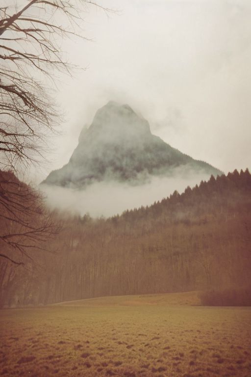 RA4_FujiCrystal, instagram photo. a foggy mountain, lord of the ring style, soft shadows, film grain