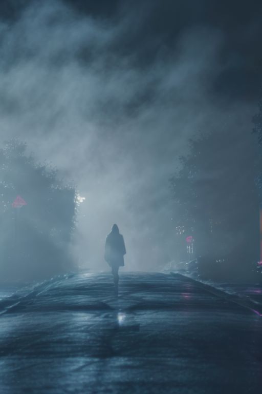suburban street with woman walking in the distance, euphoria style film still, fog, neon blue hue, at night, dark, dimly lit, low key, film grain, epiCPhoto