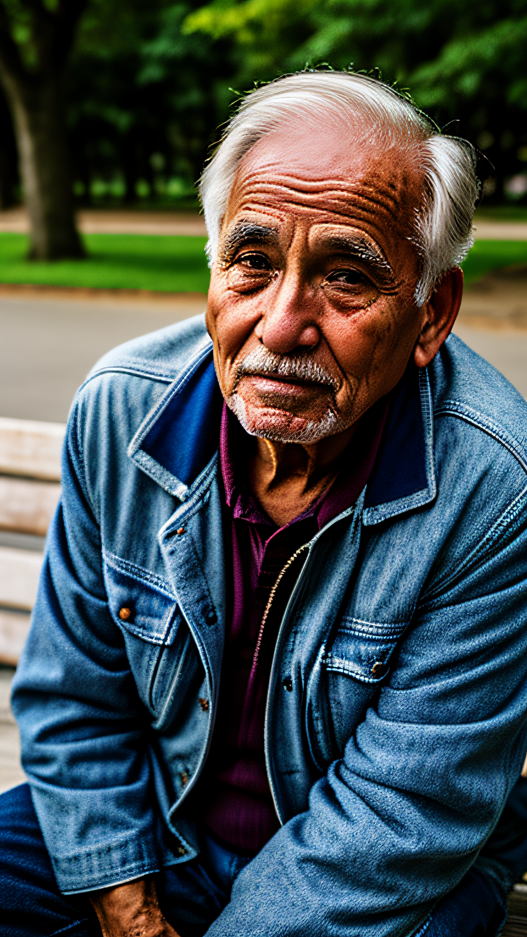 old man in old jacket, ragged clothes, sad face, sad expression, sitting on a bench alone in a park, detailed background, highly detailed face, extremely detailed, high quality, best quality, looking at viewer