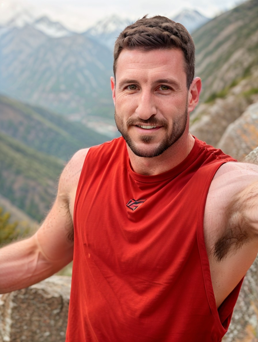 1male, (Pablo Schreiber:1) taking a selfie on a mountain rock wearing a tank top red shirt, short grease hair, t-shirt, (tongue out:1.2), natural lighting moonlight, (hairy armpits:1.25), 4k uhd, dslr, soft light, high quality, Fujifilm XT3 <lora:Pablo Schreiber:[email protected],[email protected],[email protected],[email protected]> <lora:Tank Top Stringer Shirt SD15:0.68>