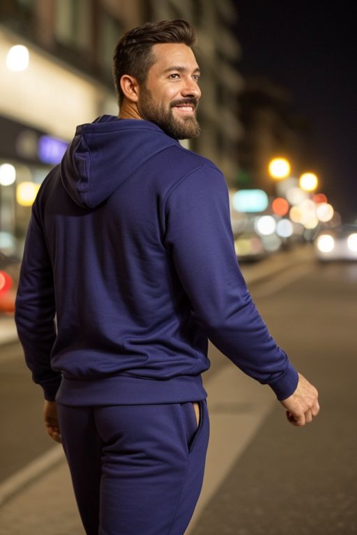 cinematic film still beautiful portrait of a handsome muscular bearded hairy man, walking in the street at night, walking towards viewer, wearing full body purple sweats outfit, large bulge , open hoodie, smile, action shot . shallow depth of field, vignette, highly detailed, high budget, bokeh, cinemascope, moody, epic, gorgeous, film grain, grainy, close up photo