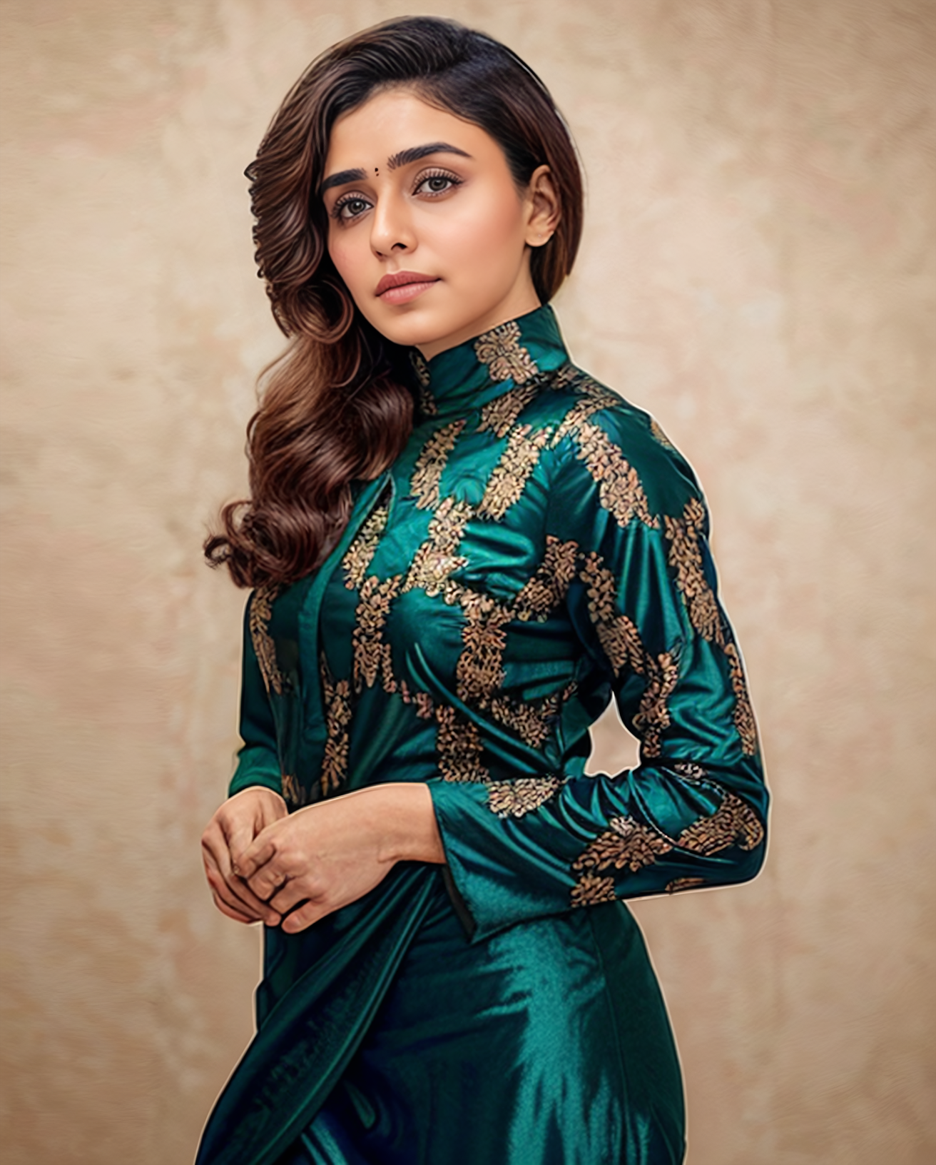 photo of amru woman, conservatively dressed, wearing turtleneck_type Emerald Phulkari Suit that cover the neck chest and abdomen, curious expression look, looking at viewer, simple country interior background in bokeh <lora:amru_Amruta_Khanvilkar_SD15_LoRA_prodigy_local_regs:1>