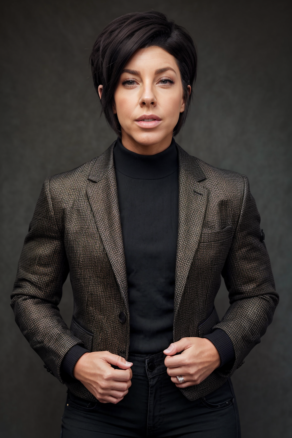danalinnbailey, woman, face, portrait, highly detailed, realistic, short hair, black hair, tanned, formal, jacket, <lora:DanaLinnBaileySD:1>