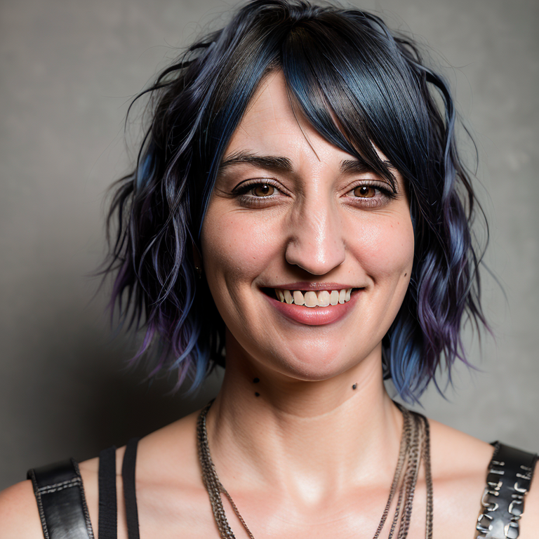 ohwx woman with short blue hair, punk style, portrait photo, smiling, professional photography, head shot <lora:2024-03-02_02-07-57-save-400-50-0:1>
