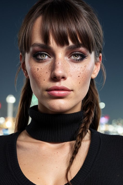 score_9, score_8_up, score_7_up, score_6_up, score_5_up, score_4_up 1girl, simple background, brown hair ponytail, swept bangs, pink sweater, cleavage, black yoga pants, elegant, beautiful, freckles, realistic, heterochromia, beautiful eyes, up close, dark shadows, night background, neon hearts lights dark, chiaroscuro, low-key <lora:SDXLCAF-000010:0.5>