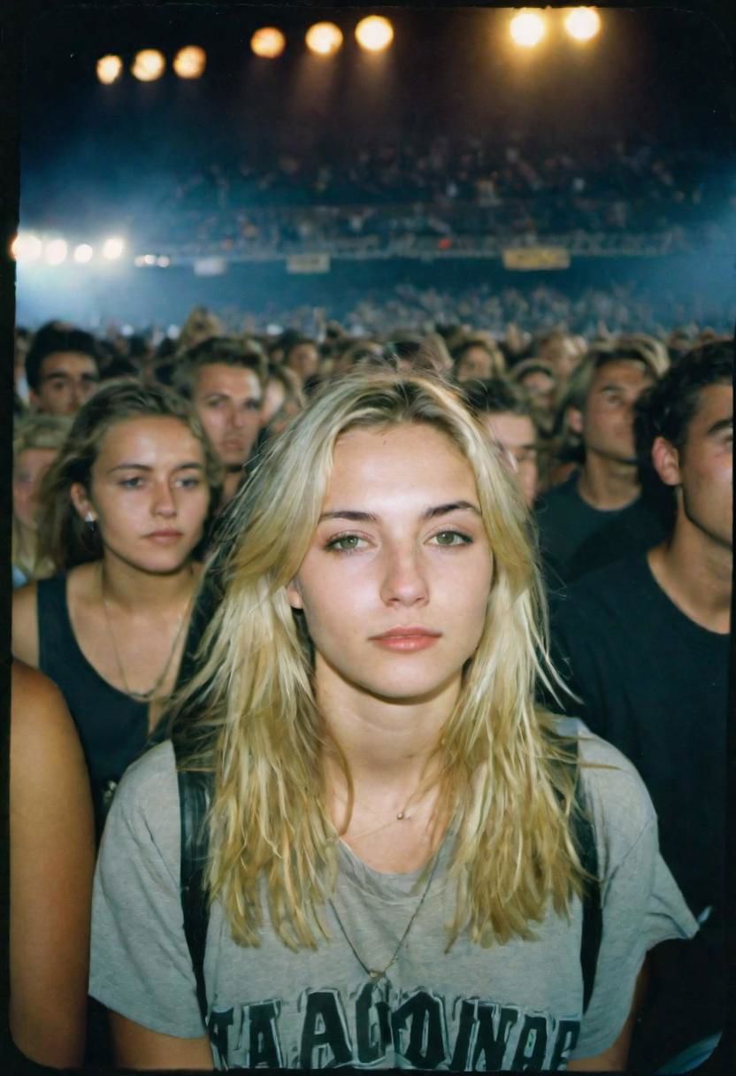 blonde girl at concert, contact test, automatic film strip,kodak gold 800 analog film, ultra wide angle, faded, blurry, pixelated, damaged, high iso, harsh shadow