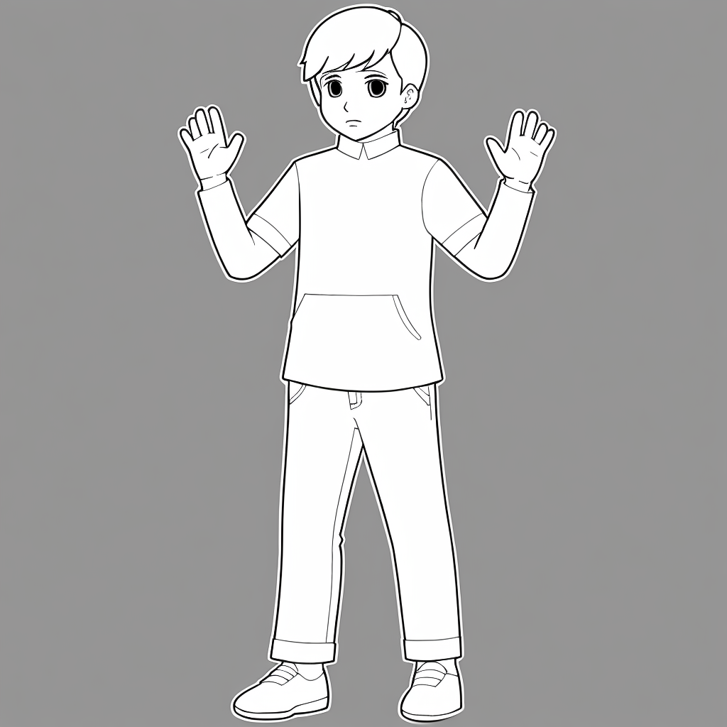 monochrome, greyscale, solo, simple background, white background,full body,lineart,boy,Raise your hand., <lora:xtmx2.0-000042:0.6>