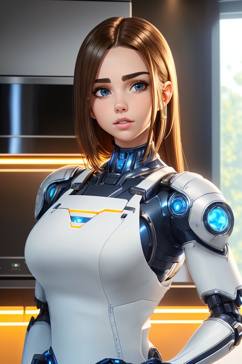 a photo of an attractive S068_SophieXDT, standing in a kitchen, wearing a (tech-mech-suit) and a apron, (8k, RAW photo, best quality, ultra high res:1.2), (absurdres, intricate, photorealistic, masterpiece, ultra-detailed, Unreal Engine:1.3)