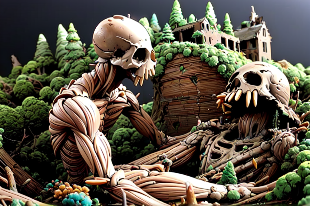giant warrior, skull, falling apart, melting, fungal forest, ruined buildings, sea of decay (skin ripped by red melting wax:1.2), <lora:Giant_WarriorC001:0.8>, side view, distance, <lora:NausicaaC002:0.2>
