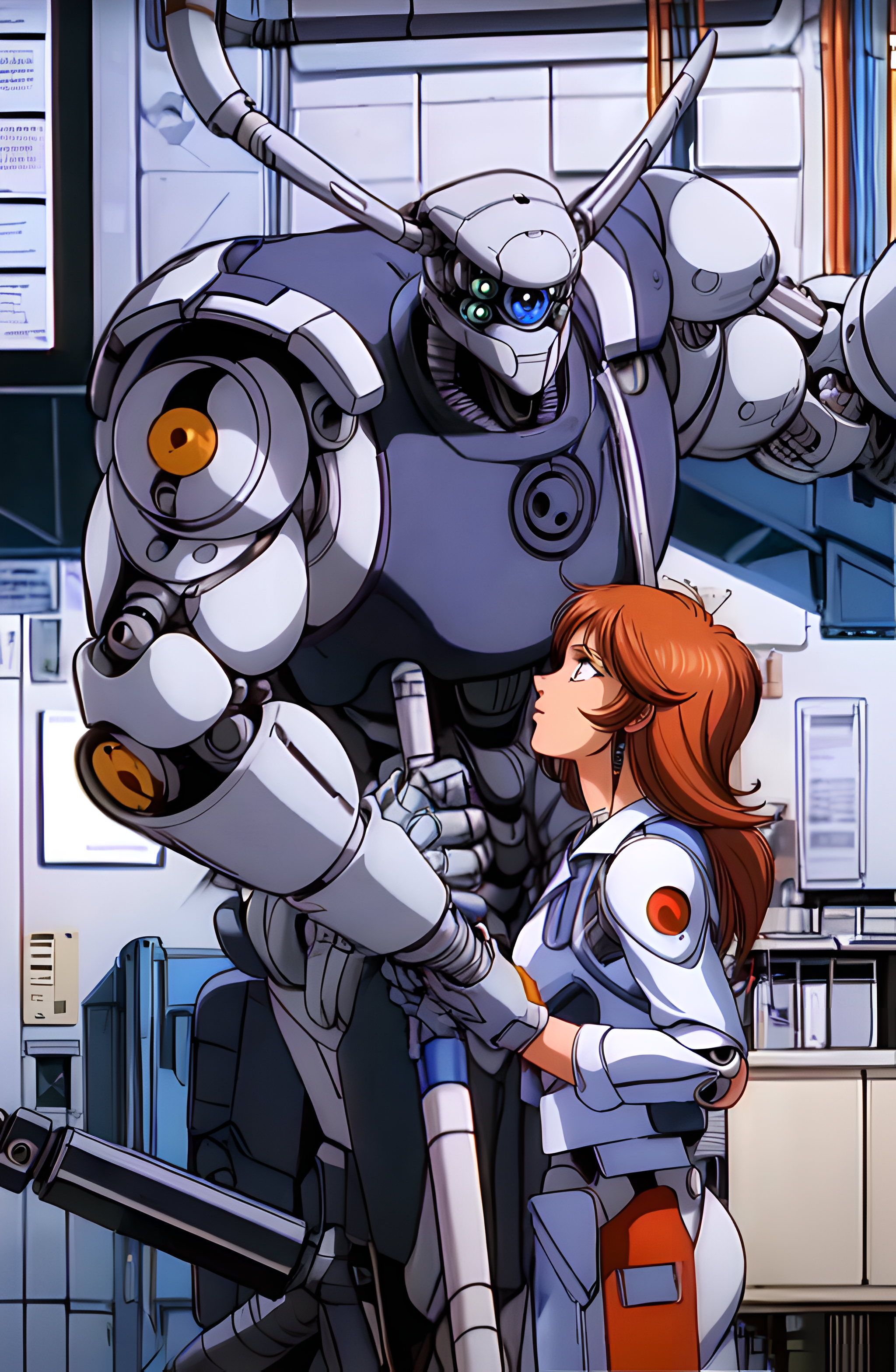 <lora:DeunanKnute002:0.7>,<lora:add_detail:1>, 1 people, Briareos, Robot, getting service at a cyborg centre, mechanics, tubes connected, replacement parts