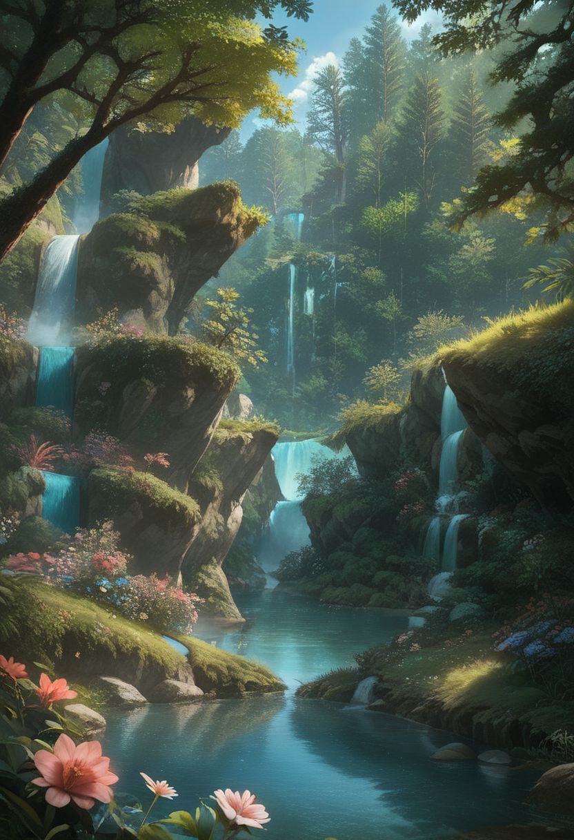 cartoon_furry, score_9, score_8_up, score_7_up, rating_safe hyperdetailed, hyperrealistic, 8k, high quality, hi res, best quality, high quality, absurd res, natural lighting, intricate, soft warm lighting, source_anime, scenario, beautiful forest,waterfall, river, trees, shrubs, flowers