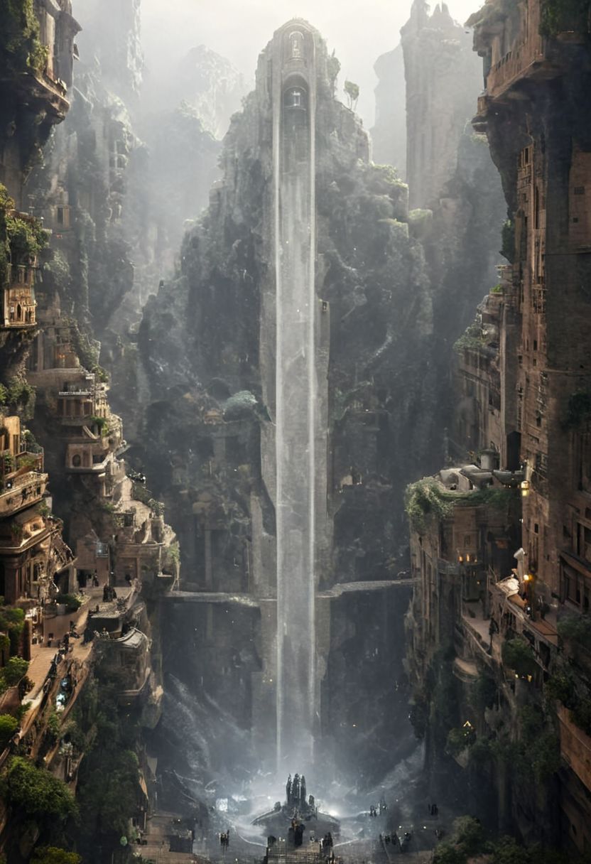 POV view , DOF, (Ancient civilization, Alien Prometheus movie scene, dune movie scene:1.5), (The colonial city of the future, in the mist-filled Grand Canyon, on an unknown Earth-like planet, 2 moon on sky, Spaceship flight connects colonies, waterfulls:1.3), (Machu Picchu, a mountain settlement, incredibly spectacular:1.2), (Mario Botta:1.3), (avant-garde, future, reality, science fiction, photorealistic), (modern architecture:1.2), White limestone with black granite, fountain, waterfall, landmark, square, path, narrow street, (Large Files, Ultra Realistic, 8K, 16k, FHD, HD, VFX, Perfect, Photography, composition, Architecture Sales Photography, Architecture Competition, Ultra High Resolution, Cinematography, High Resolution Image:1.1), (dramatic lighting, direct sunlight, ray tracing, clear shadow:1.2), (real landscape:1.1), (blurred background:1.0), (urban background, more_details) , great lighting, clear, hillscastel, <stardeaf-cold-arc>, xtower, industrialbuilding