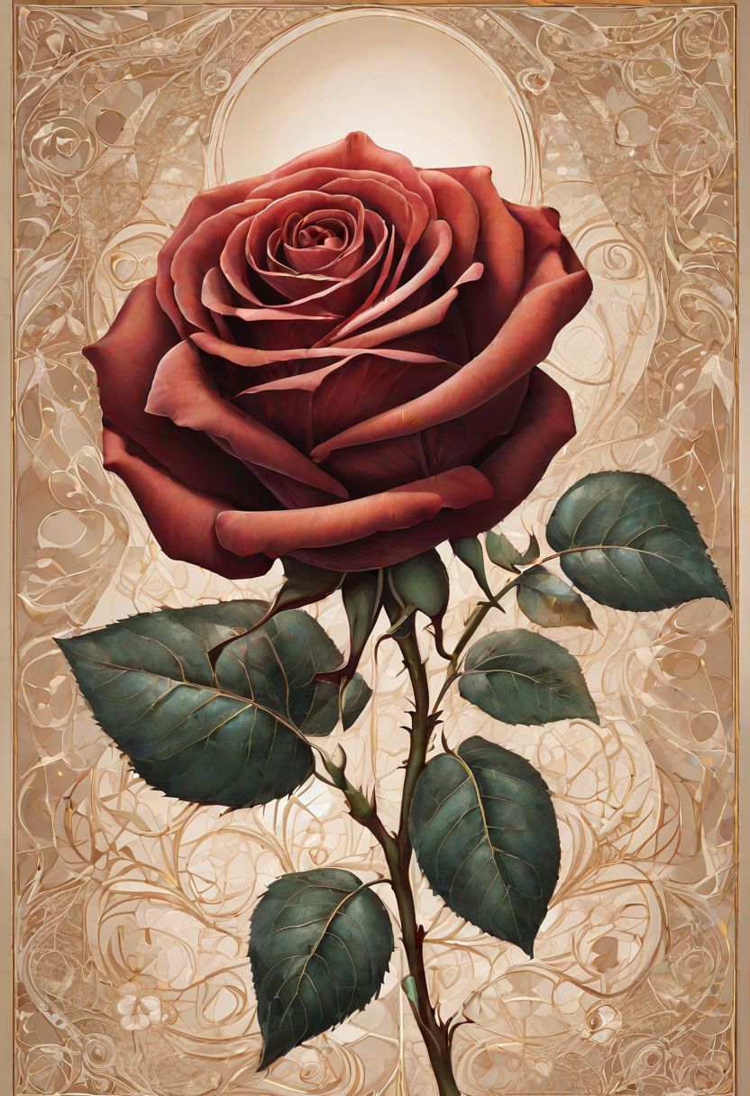 A stunning, hyper-realistic illustration of a bioluminescent red rose with a warm, earthy tone. The petals of the rose glow softly, radiating an enchanting light. The rose rests on a delicate, beige stem adorned with intricate, swirling patterns. The background features an elegant and intricate pattern that complements the floral subject. The overall atmosphere of the image is dreamy and magical, with a sense of warmth and comfort., photo, illustration