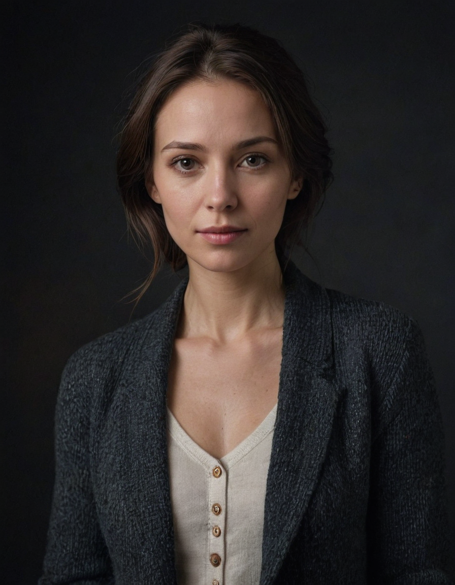 centered, portrait photo of 35 y.o woman, open jacket, sweater, natural skin, dark shot