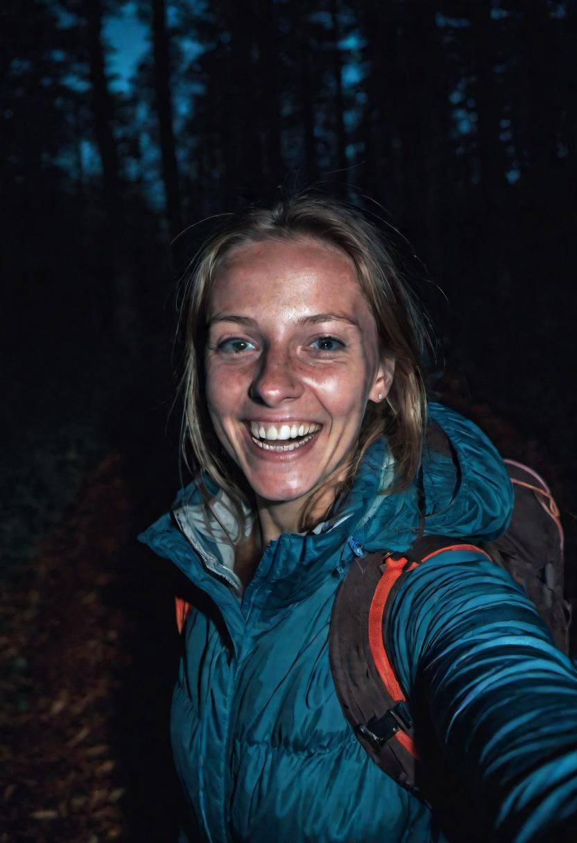 girl at night in the wood, selfie, dressed for trekking, laughing, at night, very dark, infrared photography, vhs, grainy, ((motion blur)), blurry, walking