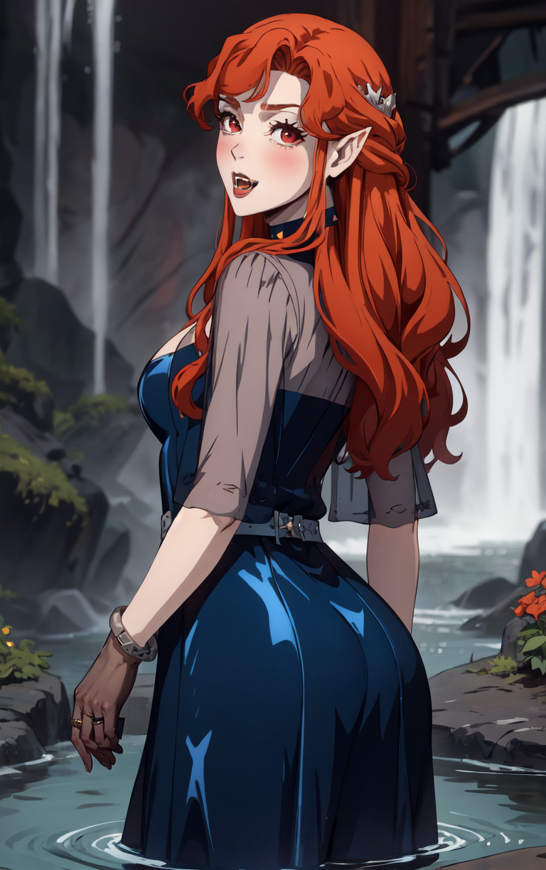 ((masterpiece, best quality)), insaneres, absurdres, solo, looking at viewer, BlueDress_Lenore_ownwaifu, 1girl, long hair, red eyes, blush, pointy ears, lips, breasts, red hair, hair ornament, braid, fangs, makeup, lipstick, black lips, vampire, very long hair, wavy hair, colored skin, blunt bangs, cleavage, dress, jewelry, gloves, blue dress, see-through, grey gloves, see-through sleeves, ring, long dress, belt, choker, bracelet, (wading, ass support), waterfall, <lora:CARTOON_Castlevania_Lenore_ownwaifu:0.75>, depth of field, vanishing point, garden, sidelighting,