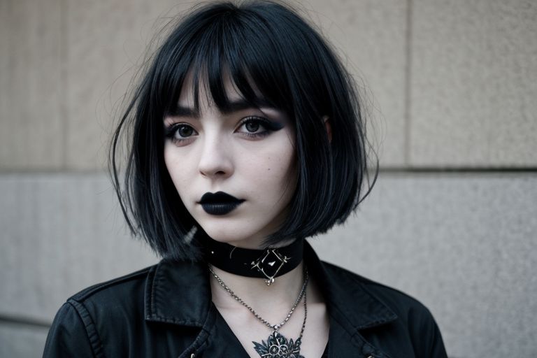 Teen brunnete nordic goth girl | tattoo | dark | Adult | On street | High quality | gothic makeup | realistic | informal | cute girl | bob cut hair | choker | solo | black hair