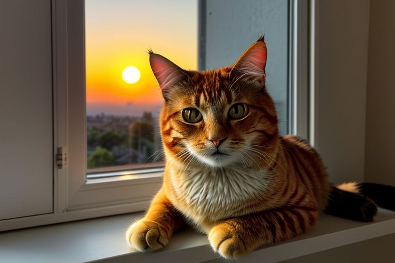 I want you to generate an image of a fluffy orange cat sitting on the windowsill. The cat looks at the setting sun and the light from the sunset shines on its fur. The image is realistic and has a warm, welcoming atmosphere."
