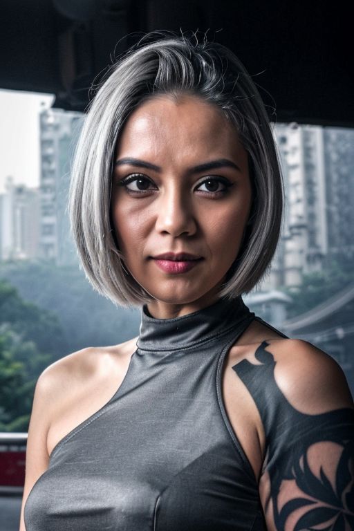 <lora:Cos001:0.70>,closeup pov photo detailed face, realistic photo of syorha no. 2 type, shoulder length grey hair, serious expression, tattoos, folded arms, stood in a hong kong street, (masterpiece:1.0), (best quality:1.0), cinematic,smoke filled atmosphere,