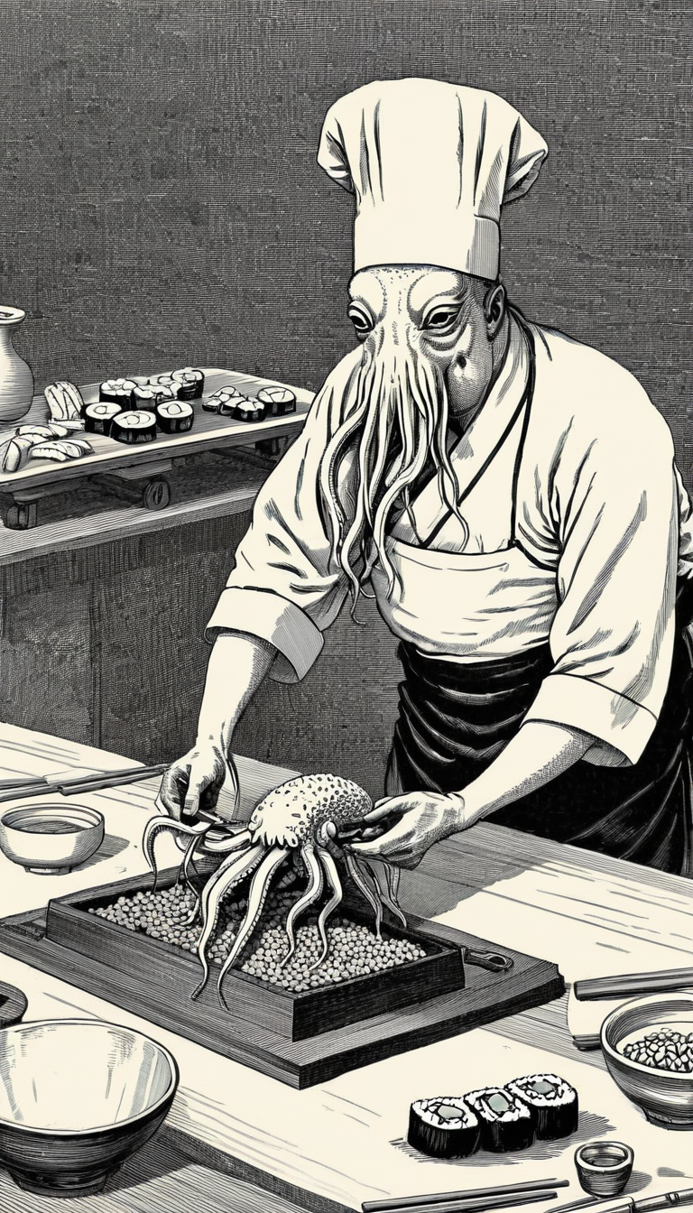 octopus squid making sushi <lora:vntg-line-art-v2:1> vntg, line-art