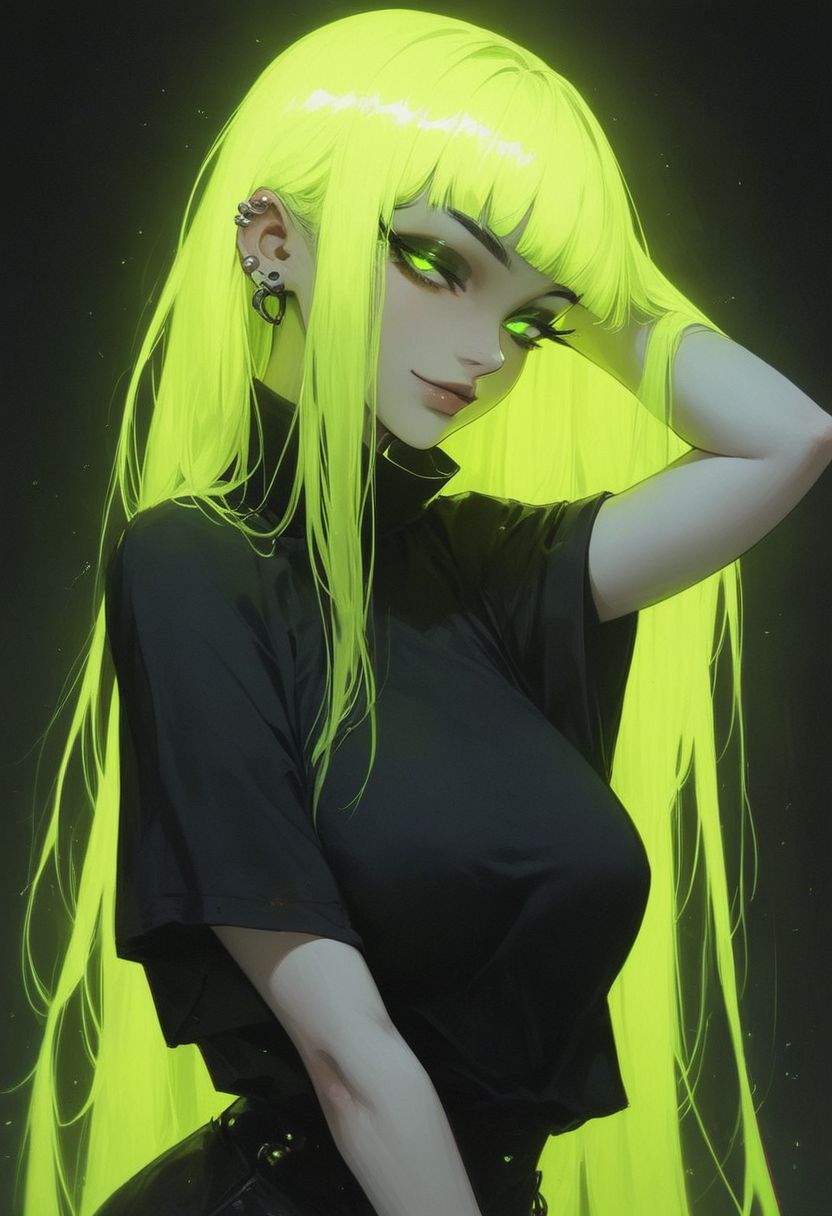 score_9, score_8_up, score_7_up, masterpiece, best quality, highly detailed, 1girl, pale skin, green eyes, thick black eyelashes, black eyeliner, dark eyeshadow, neon green hair, long hair, bangs, big breasts, oversized black t-shirt, ear piercings, looking at the viewer, bedroom eyes, seductive smile, g0thicPXL, glowing hair, glowing eyes, neon, arm behind head, arched back, dark background, cowboy shot