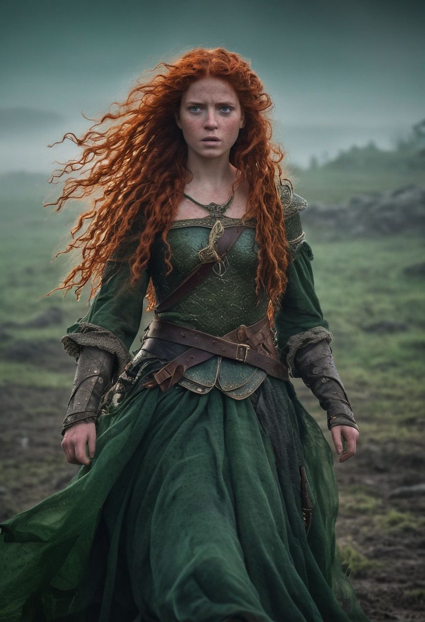 Close Up shot of Merida from the Brave tale as a princess warrior, she IS a very beautiful girl, long curly red hair, beautiful, ancient celtic armour, dirt Green dress, wind, at night, fog, mist, battlefield at the background, National Geographic photography awarded masterpiece
