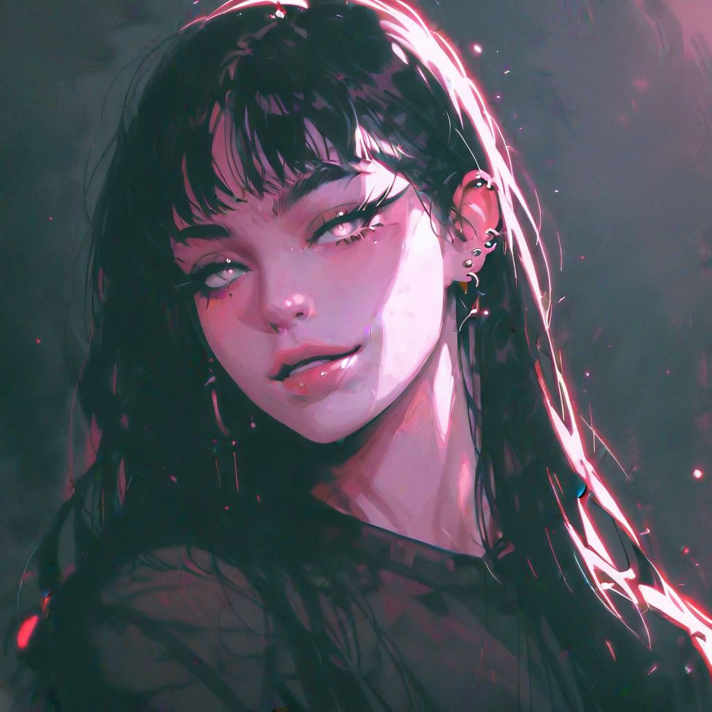 masterpiece, best quality, highly detailed, 1girl, pale skin, detailed eyes, face, thick black eyelashes, black eyeliner, dark eyeshadow, dark hair, long hair, oversized black t-shirt, ear piercings, looking at the viewer, bedroom eyes, seductive smile, g0thicPXL, backlight, arched back, dark background, thick white character outline