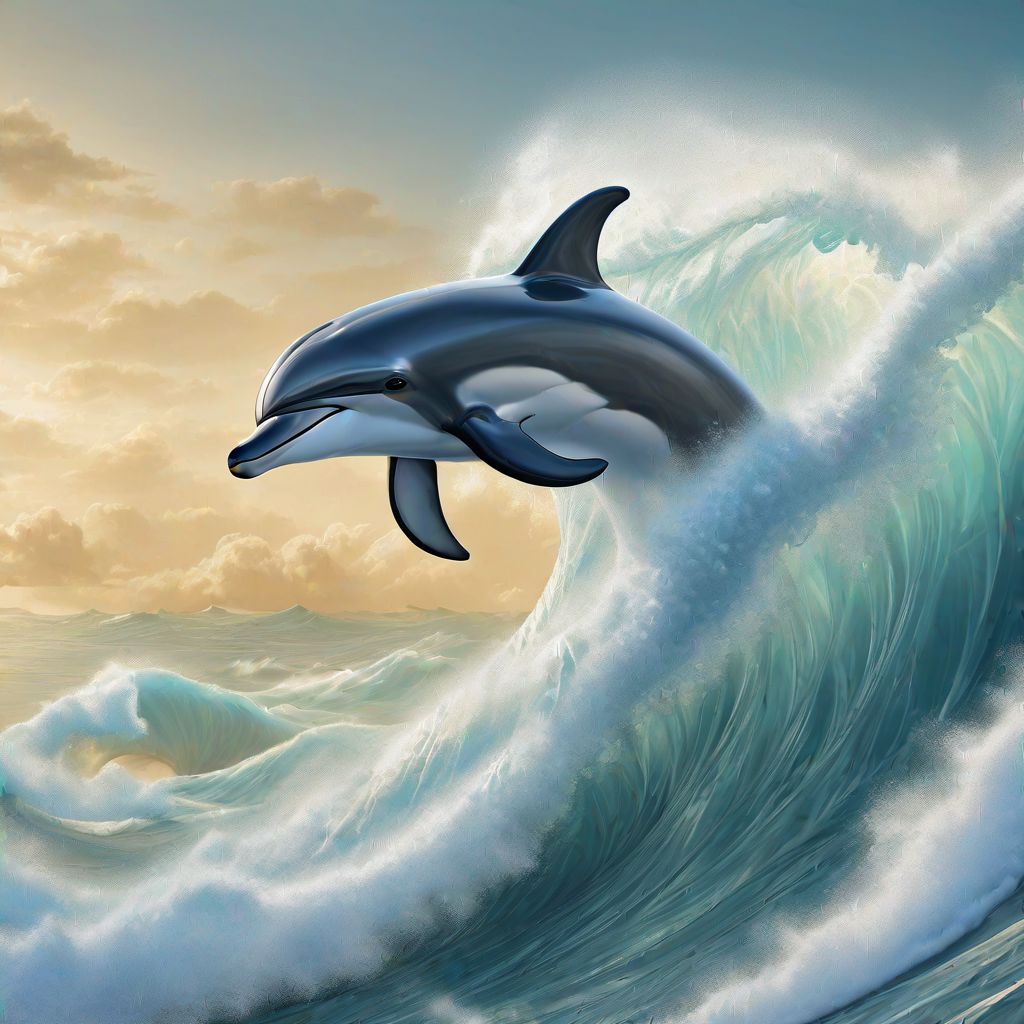 dolphin on the crest of a foamy wave, ultra-realistic digital painting, golden ratio. All details are clearly drawn, wave, dolphin, eyes, foam