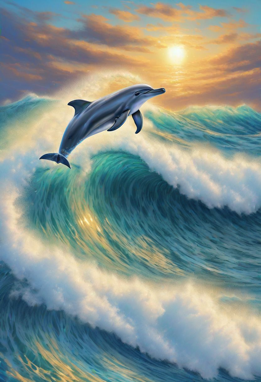dolphin on the crest of a foamy wave, ultra-realistic digital painting, golden ratio. All details are clearly drawn, wave, dolphin, eyes, foam