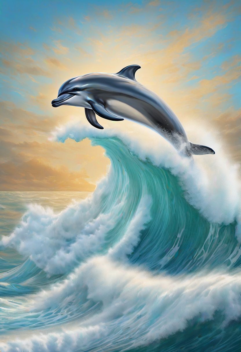 dolphin on the crest of a foamy wave, ultra-realistic digital painting, golden ratio. All details are clearly drawn, wave, dolphin, eyes, foam