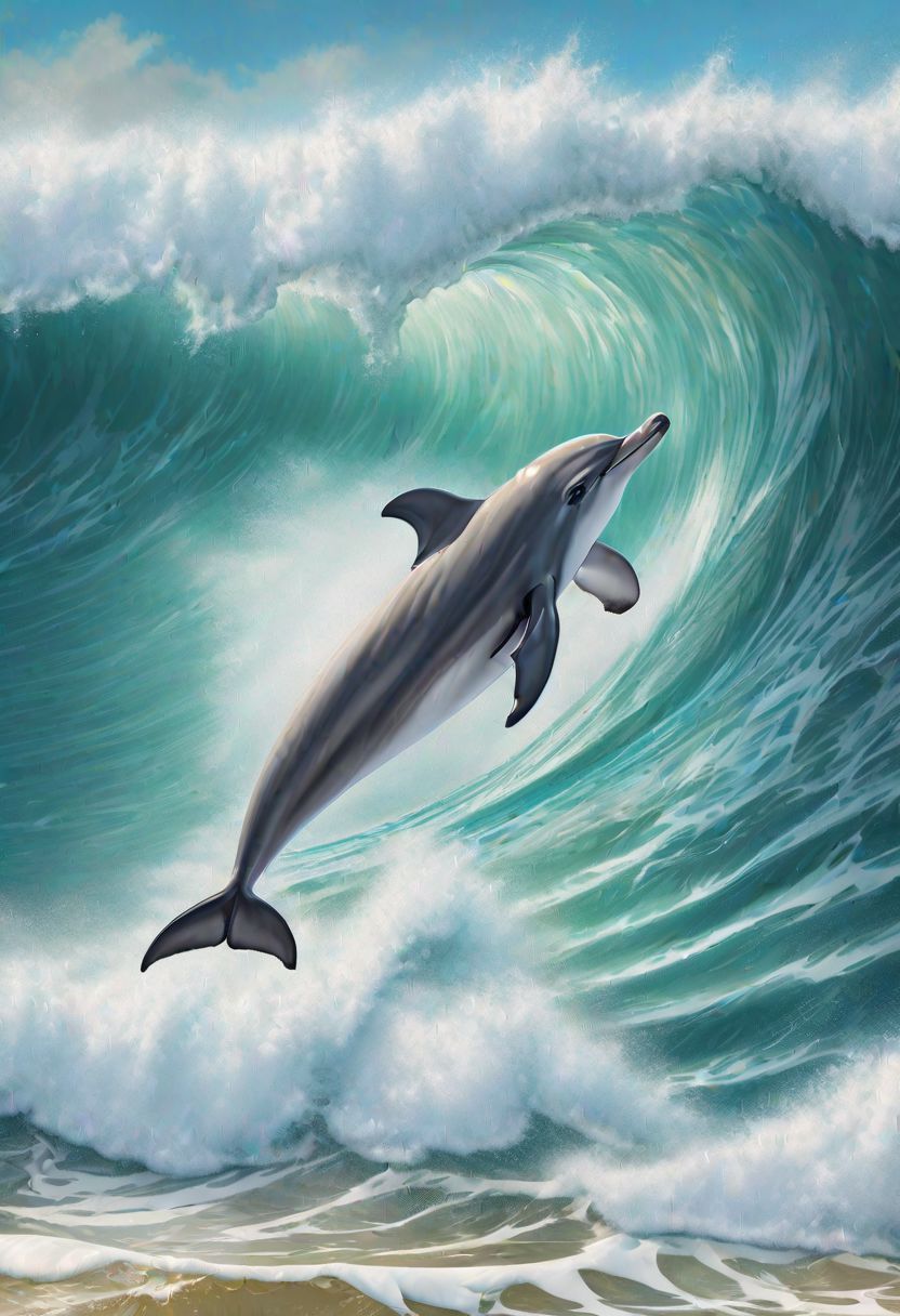 dolphin on the crest of a foamy wave, ultra-realistic digital painting, golden ratio. All details are clearly drawn, wave, dolphin, eyes, foam