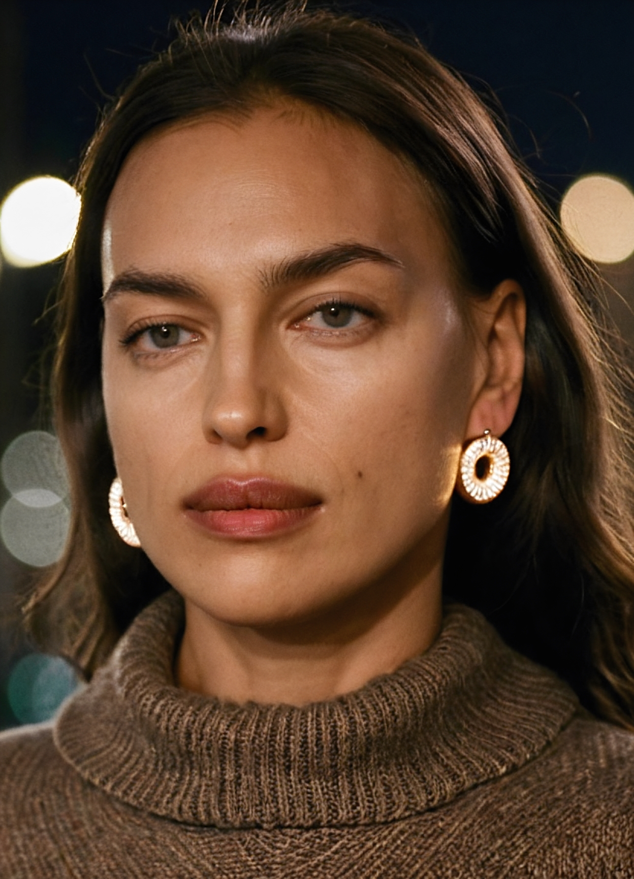 ir1na woman,round earrings,close-up,long hair pulled back,front view,F/1.8,volumetric lighting,wearing sweater,highly detailed skin,pores,night,city street