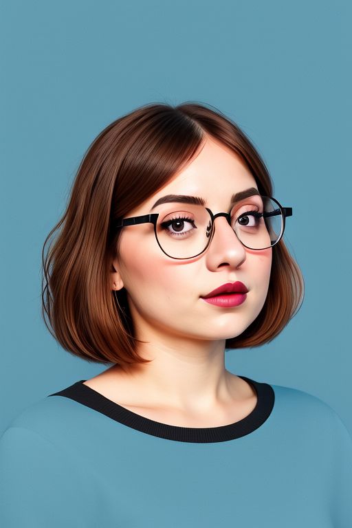 Meg Griffin, plump lips, aquiline nose, shortstack, brown hair, glasses, Minimalist illustration, muse of the arts, dancing linework, resonating with a secret tune, orange blue gradient background, highly detailed, deep darks, high contrast, masterpiece, 8k, French vibe