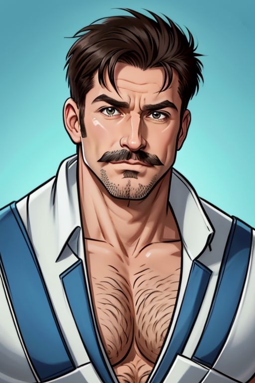 cartoon portrait of 40 year old man leoricvisionaries, no helmet, short hair, looking at viewer, hairy chested, muscular manly man, 80s cartoon