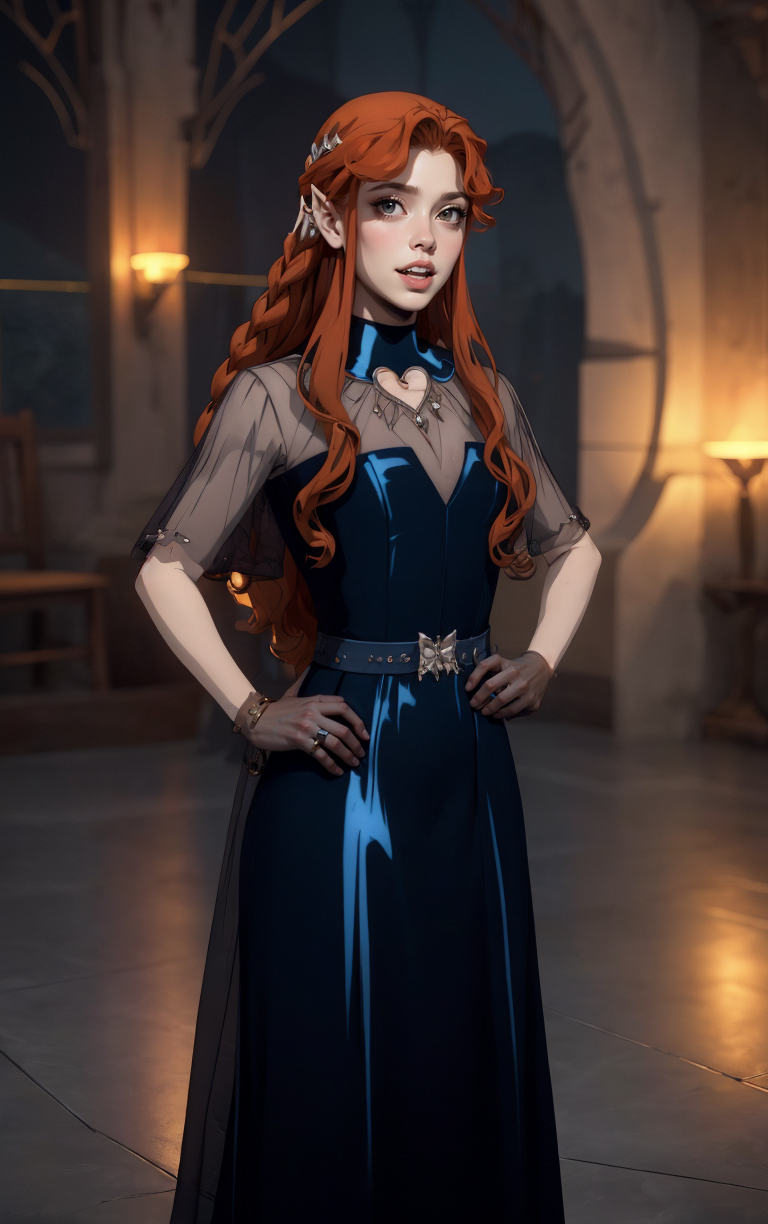 ((masterpiece, best quality)), insaneres, absurdres, solo, looking at viewer, BlueDress_Lenore_ownwaifu, 1girl, long hair, red eyes, blush, pointy ears, lips, breasts, red hair, hair ornament, braid, fangs, makeup, lipstick, black lips, vampire, very long hair, wavy hair, colored skin, blunt bangs, cleavage, dress, jewelry, gloves, blue dress, see-through, grey gloves, see-through sleeves, ring, long dress, belt, choker, bracelet, (contrapposto, hand on hip)<lora:CARTOON_Castlevania_Lenore_ownwaifu:1>, depth of field, vanishing point, garden, sidelighting,