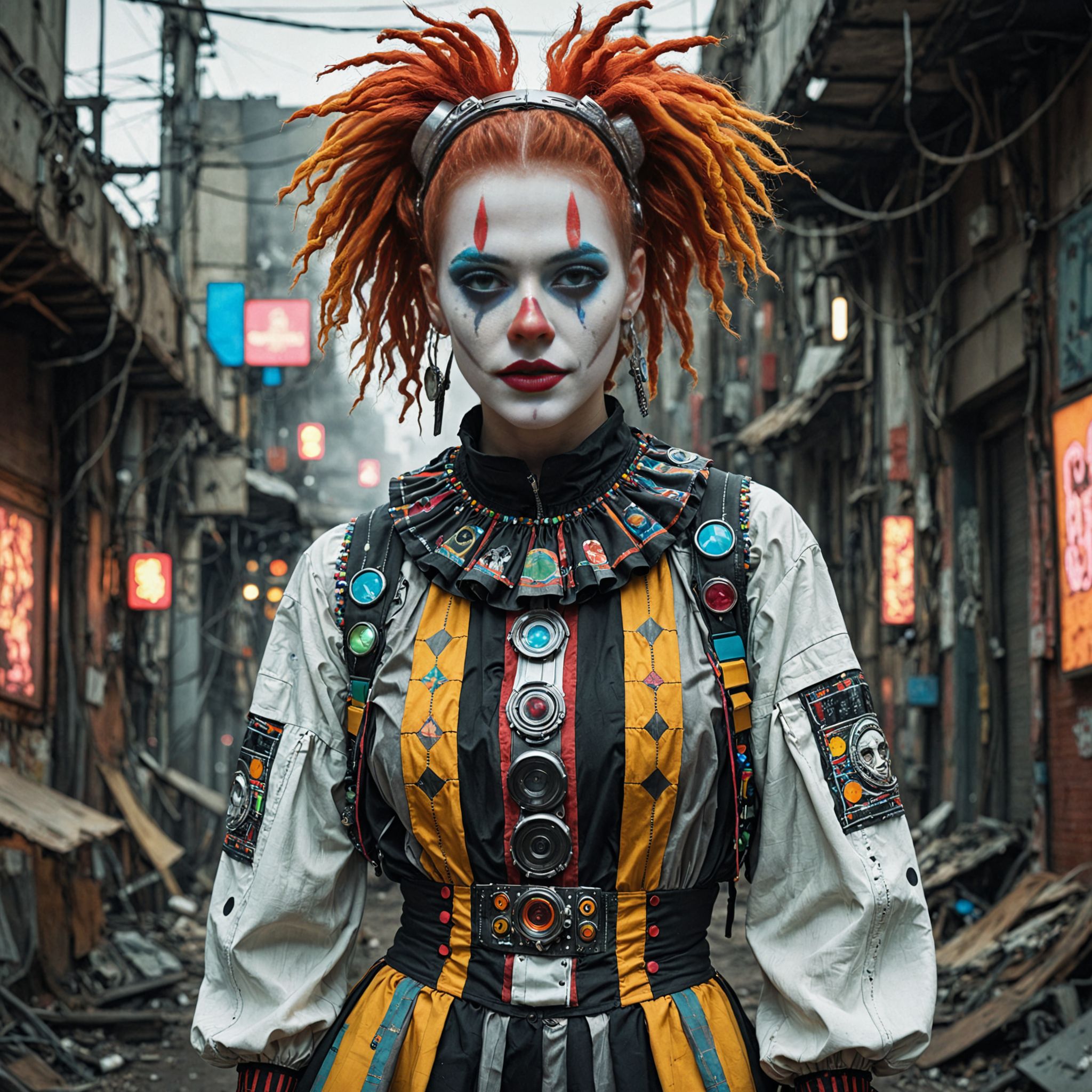 woman,classical realism, clown, bohemian outfit, acidwave, Cyberpunk fashion style, inspired by futuristic dystopian settings, features high-tech and futuristic clothing, incorporates elements of technology and urban culture, promotes a bold and avant-garde aesthetic