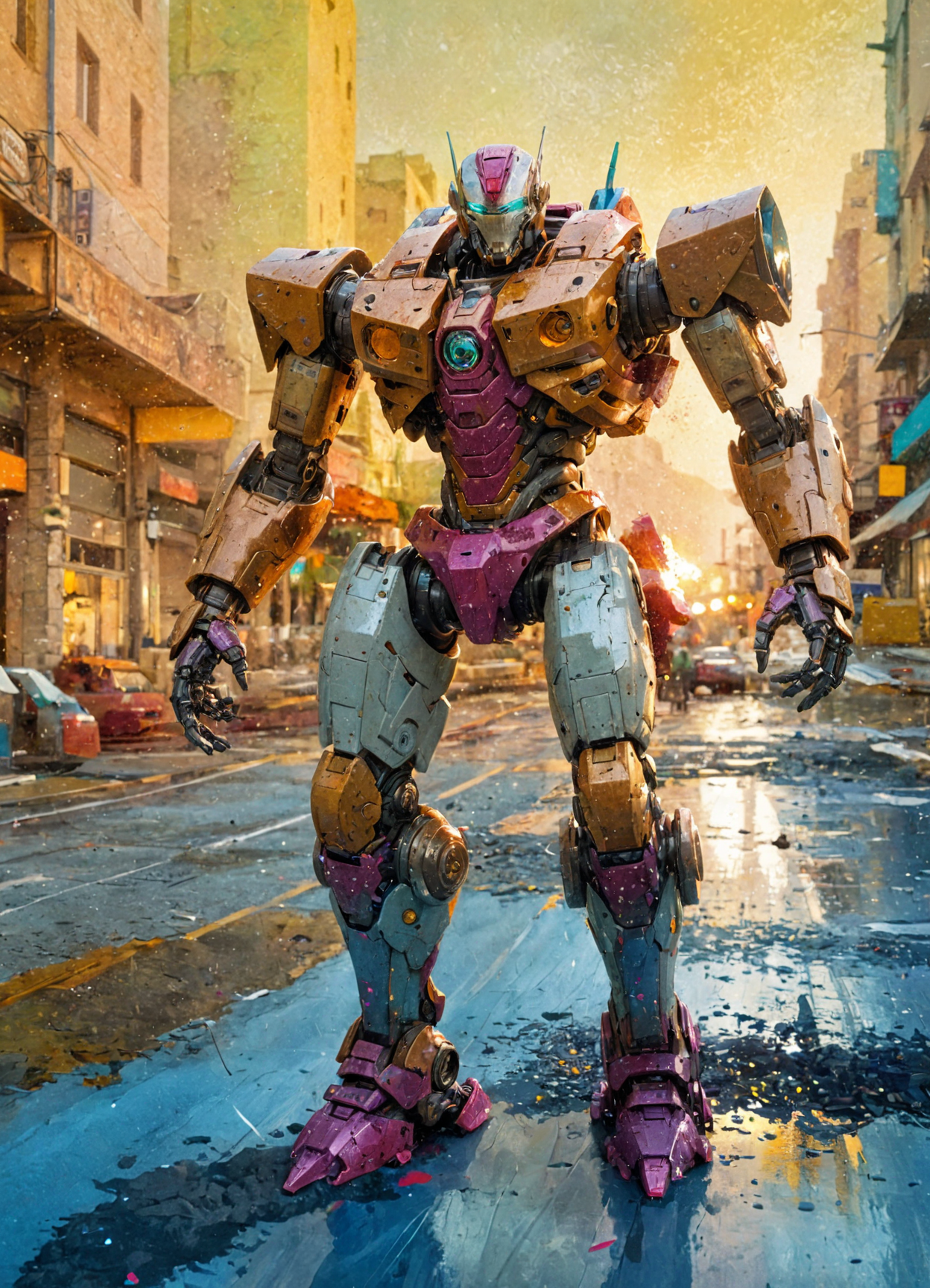 cgi, high quality render of mecha robot, perfect environment, city, sci-fi, extremely detailed, dof, bokeh