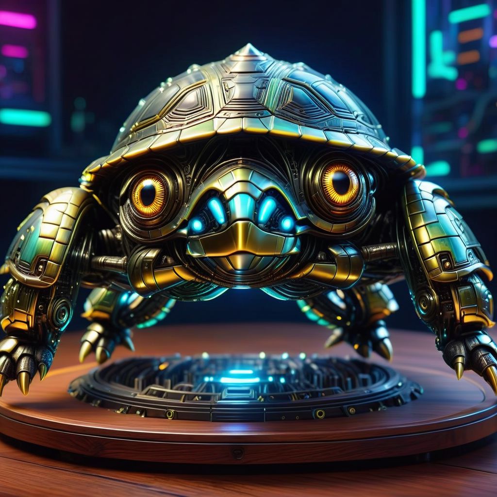 photo of a Roboticizer mechanical turtle, tracked,armed,color of different alloys,steel,gold,on a wooden table,neon sparkling eyes,glowing,sci fi, HD, masterpiece, best quality, hyper detailed, ultra detailed, realistic image