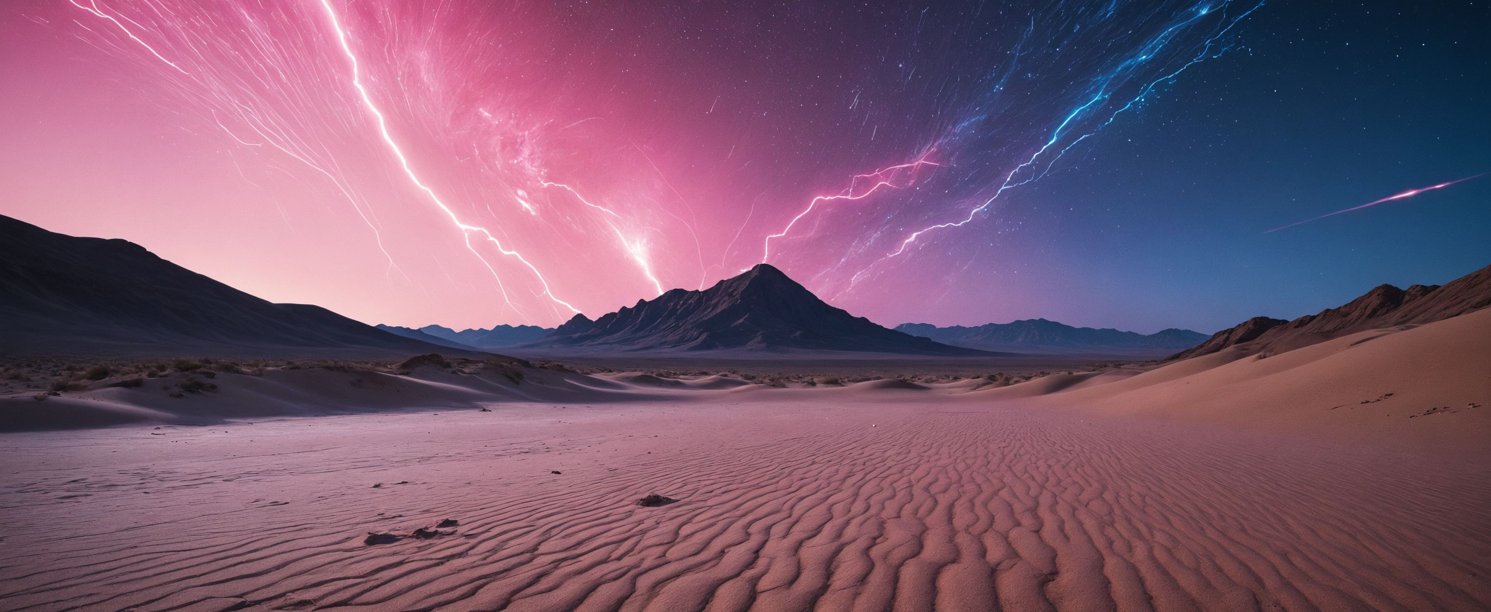ethereal fantasy concept art of sci-fi style metaphysical style photorealistic cinematic photo HDR photo of (A magnetic field-covered desert with sand that glows in vibrant magnetic fields, painting the ground in electrifying shades of neon pink and electric blue) . High dynamic range, vivid, rich details, clear shadows and highlights, realistic, intense, enhanced contrast, highly detailed . 35mm photograph, film, bokeh, professional, 4k, highly detailed . highly detailed, lifelike, precise, accurate . surreal, eerie, uncanny, detailed . futuristic, technological, alien worlds, space themes, advanced civilizations . magnificent, celestial, ethereal, painterly, epic, majestic, magical, fantasy art, cover art, dreamy