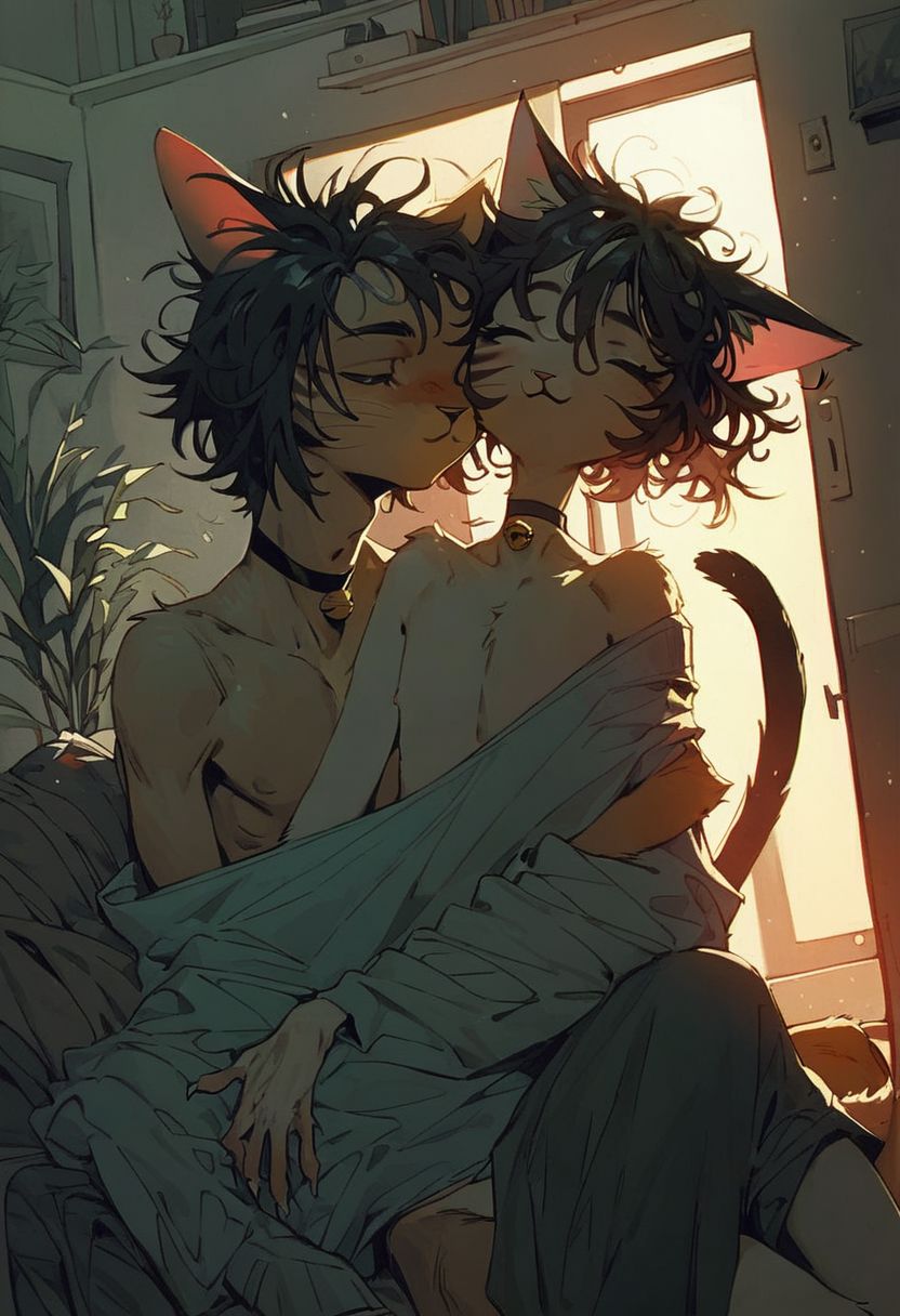 score_9, score_8_up, score_7_up, (cat girls), (cat boy), 1girl 1boy, untidy living room, early morning, anthro, skinny, heterosexual, couple, cuddling, partially undressed, messy hair, choker, oversized clothes, dutch angle, alternate hairstyles, top and sub, feminine,