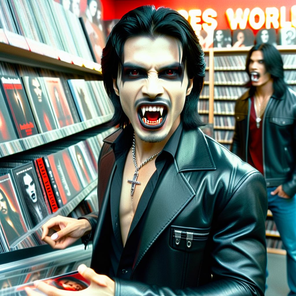 Vampyfangs1. a film still photo. 35mm. 4k. From a 2003 movie. A Mexican vampire man is showing off his fangs, he is walking around a record store. Looking at an album.