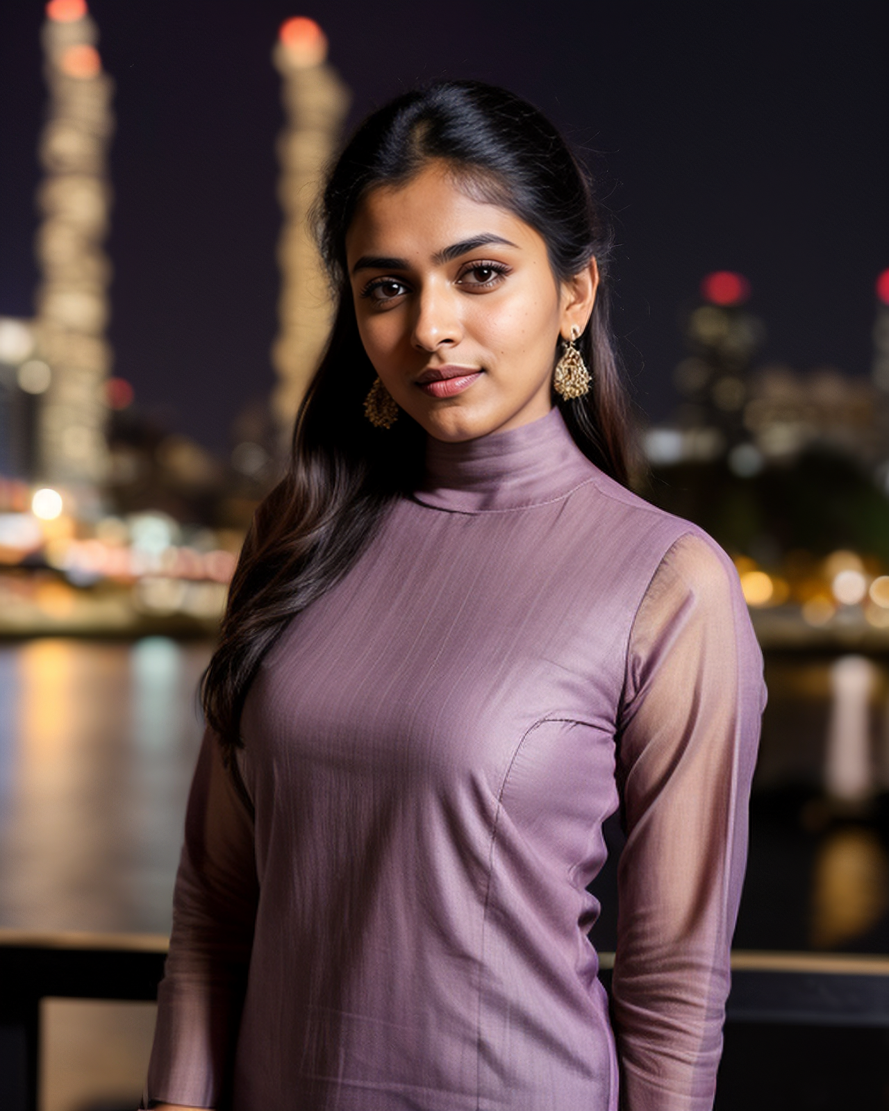 a photo of a cute 30-year-old woman, dgmochav2_TI, professional portrait photo,Eyebrow furrow of confusion look on face, high neck Mauve Jeans_with_kurta, high ponytail and bangs, soft lighting, solo, night time, city bokeh lights