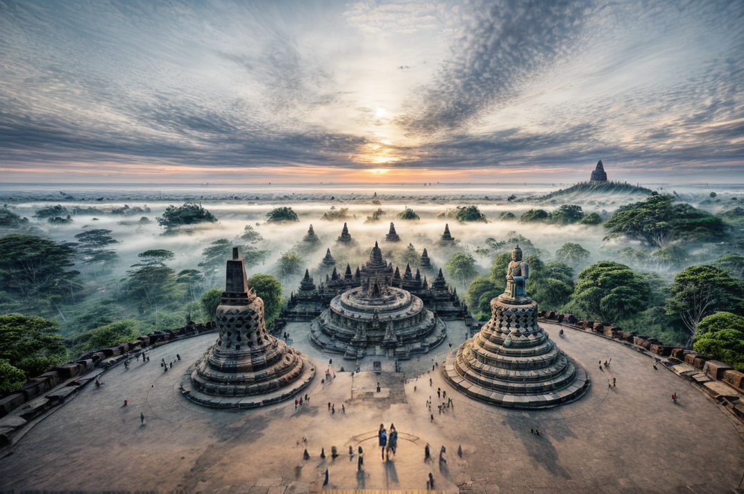 a man in front of gigantic candi buddha building on mountain, statue of buddha, reflective floor, epic, fog, dawn, dramatic lighting, dim light, forest, cliff, <lora:ARWCandiBuddha:1> advntr, <lora:epi_noiseoffset2:0.6> <lora:add_detail:0.4>